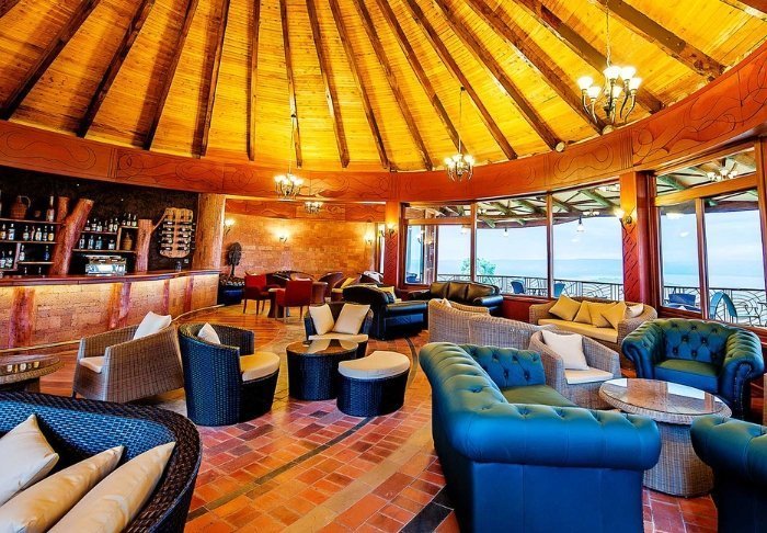 Hovedbygningen byder på en imposant lounge samt bar og restaurant. På kølige aftner tændes der op i pejsen indenfor – på lune aftener kan du nyde din drink på den store udendørs terrasse.