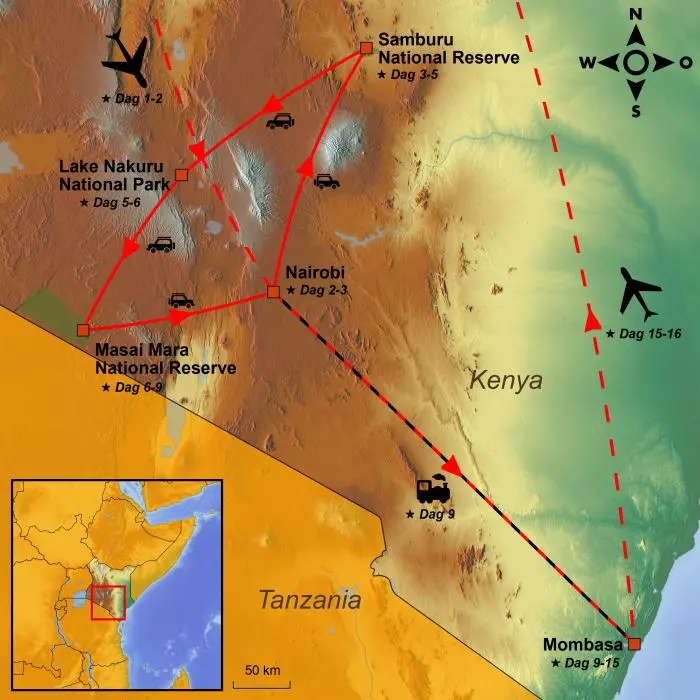 Du krydser ækvator og har mulighed for at komme helt tæt på det fantastiske og mangfoldige dyreliv i nationalparkerne Samburu og Masai Mara med sine karakteristiske akacietræer, der giver skygge til savannens dyr. Du oplever de fantastiske landskaber ved den 5.000 km lange Great Rift Valley med vandfald, vulkankratere og nationalparken Lake Nakuru, som er kendt for næsehorn og flamingoer.