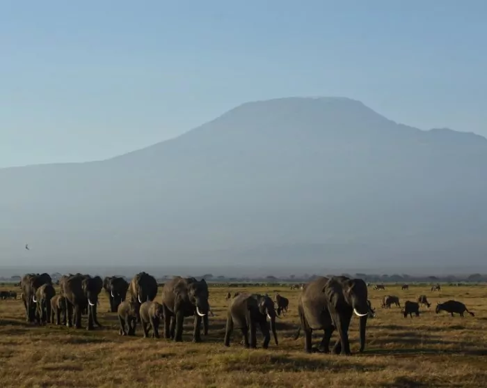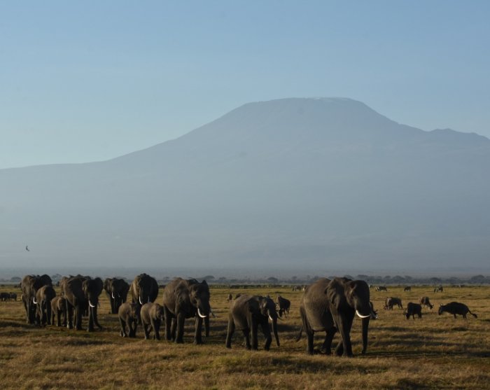 Næsten overalt har du udsigt til Kilimanjaro, som godt nok ligger i Tanzania, men som formodentlig oftere er fotograferet fra Kenya-siden. Det er nemlig her i Amboseli, at du kan være heldig at få det perfekte skud af elefanterne, som i solnedgangen traver over det pandekageflade landskab for at komme ind i skovene ved foden af Kilimanjaro, hvor de tilbringer natten. Flokkene af elefanter er store, og mange af elefanterne har gigantiske stødtænder!