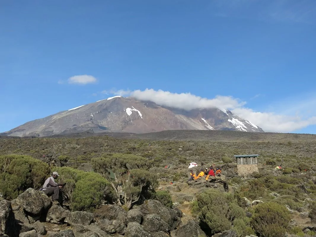 Du vandrer det sidste stykke gennem regnskoven, og snart åbner hedelandskabet sig og stierne bliver mere stenede. Du vandrer over Shira plateauet med udsigt til Kilimanjaro Western Breach, som er den vestlige kraterkant med den fantastiske gletsjer. Du er nu vest for den udslukte vulkan Kibo på den modsatte side af Marangu ruten og efter et kort hike mod vest ankommer du til Shira 2 Camp.