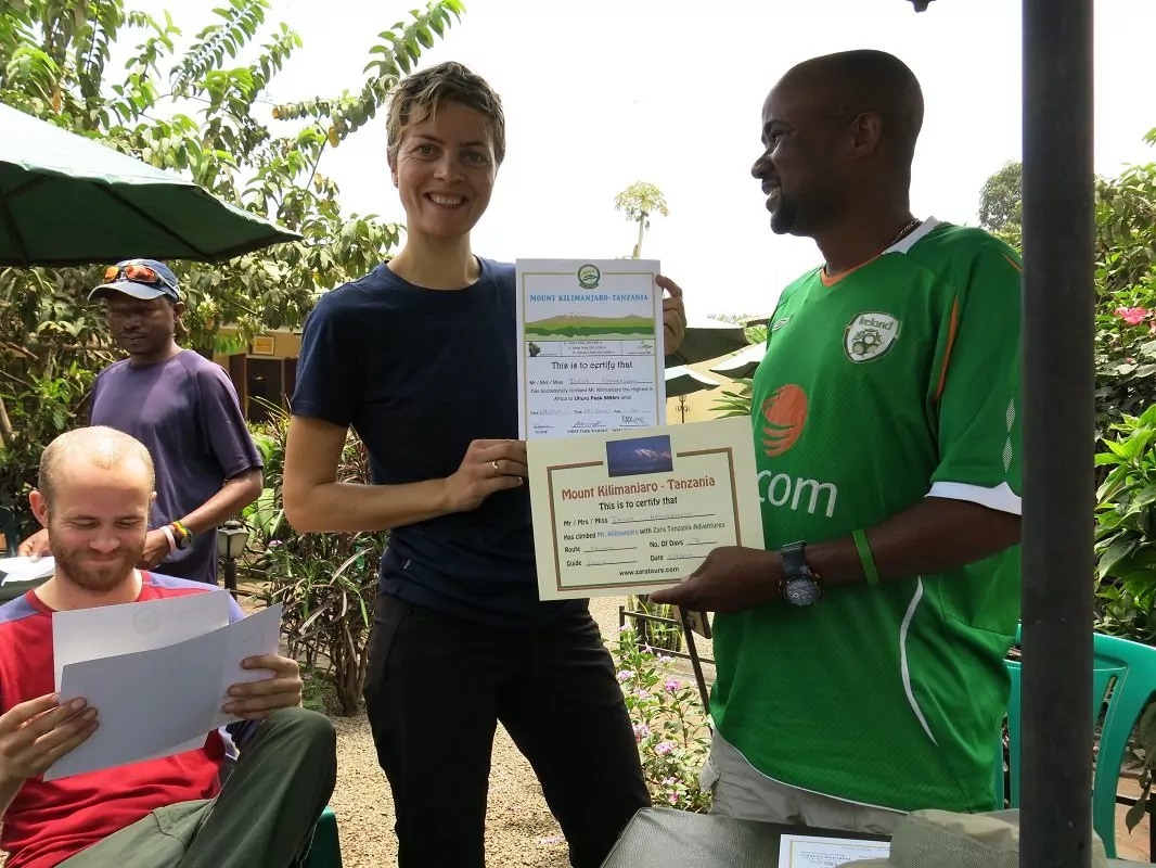 Turens sidste vandreetape er 3 nemme timer gennem nationalparken til Mweka Gate. Her tjekker du ud, inden du bliver kørt tilbage til landsbyen Moshi. På hotellet venter dig en velsmagende frokost og et – med længsel ventet – dejligt varmt bad. Alle der har gennemført bestigningen får overrakt et diplom.