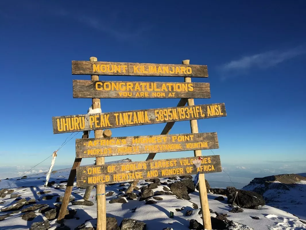 Omkring midnat står du op og du får serveret en snack, inden du i mørke starter den sidste opstigning til toppen. Det vanskelige terræn de ca. 6 timer frem til Stella Point er den største udfordring for de fleste. Målet er at nå Stella Point kort tid efter solopgang, så du kan nyde den rødglødende solopgang her. Hvilet bliver ikke langt, da det ellers bliver nærmest uoverkommeligt at komme i gang igen som følge af kulde og træthed. Du fortsætter langs kraterkanten og det sidste stykke er en jævn stigning. Afhængig af årstiden kan du risikere, at der er sne det sidste stykke til dit endelige mål, som er Uhuru Peak, toppen af Kilimanjaro og toppen af Afrika. Når du toppen 5.895 m.o.h., kan du klappe dig selv på skulderen, nyde den fantastiske udsigt og tage et selfie ved Uhuru Peak skiltet, som evigt minde.