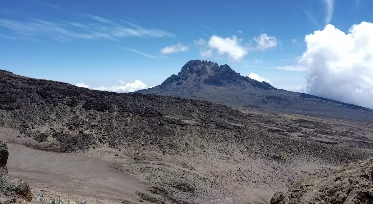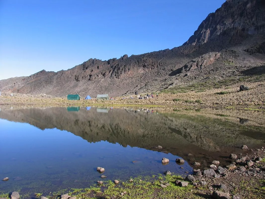 Dagens etape er til Mawenzi Tarn Hut. Efter en kort, men stejl stigning op ad græsklædte bjergskråninger belønnes du med en fantastisk panoramaudsigt. Hedelandskabet bliver erstattet af det klippefyldte højland præget af store og små vulkansten, som vidner om den tidligere vulkanske aktivitet. Efter yderligere et par timers vandring når du dagens overnatningssted, som har en spektakulær beliggenhed i en dal under Mawenzis tårnhøje spir.