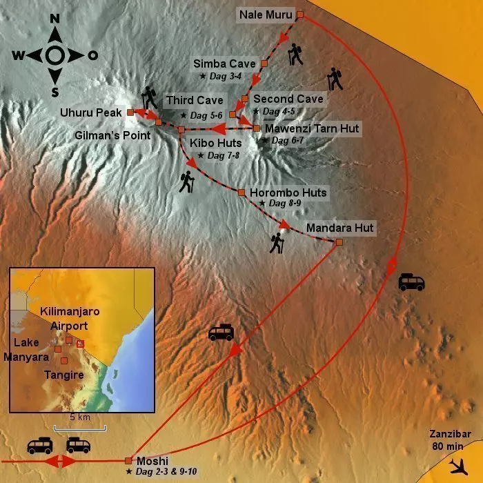 Højder: Kibo Huts: 4.695 m.o.h., Uhuru Peak: 5.895 m.o.h., Horombo Huts: 3.690 m.o.h.