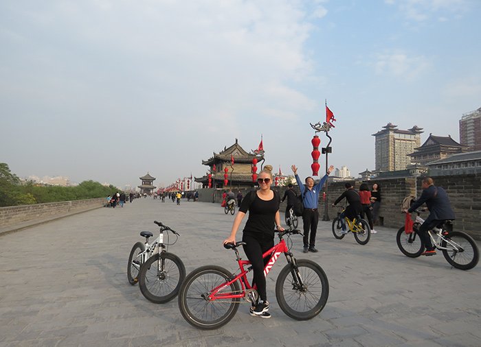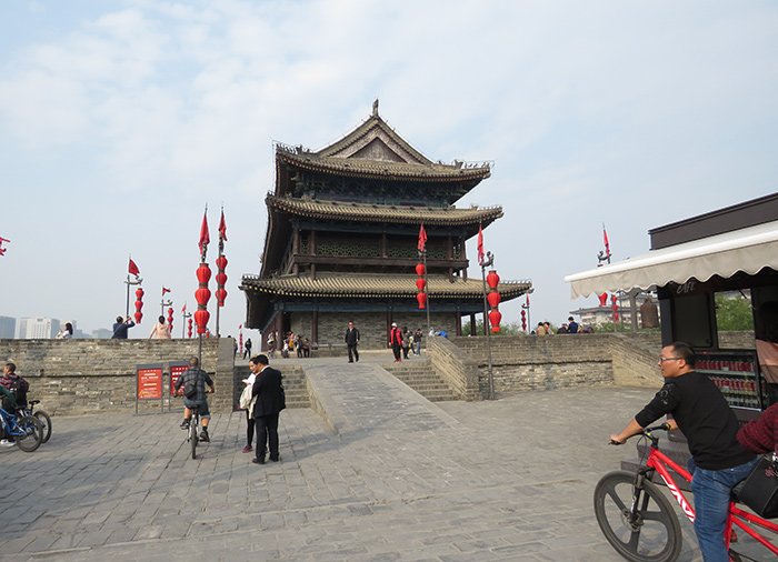 Bymuren er 13,7 km, og langs muren er der flotte røde lanterner og gamle vagttårne. Cykelturen giver et godt overblik over Xi’an, og du ser byen fra en helt anden vinkel – nemlig fra 12 meters højde.
