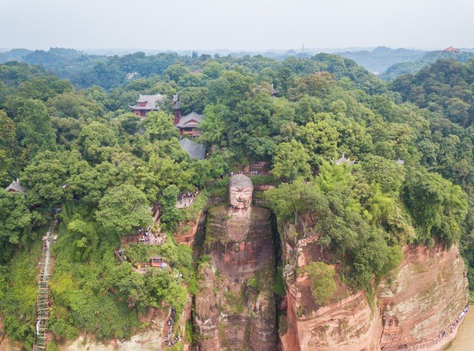 Du ankommer til en udsigtsplatform, hvor du nærmest står ansigt til ansigt med buddhaen, som har en højde på 71 meter og en bredde på 28 meter. Her kan du beundre de 1.021 fine udhuggede hårbundter. En smal stentrappe på 217 trin fører ned langs buddhaens side og hele vejen ned til fødderne. Undervejs kan du beundre den imponerende statue fra forskellige vinkler. Størrelsen vil komme bag på de fleste – bl.a. har hovedet en størrelse på 14,7 meter, fingrene måler 8,3 meter med fingernegle der er større end det gennemsnitlige menneske, og så har fødderne en længde på 11 meter. Statuen er virkelig imponerende og overvældende!
