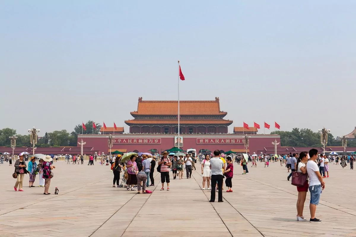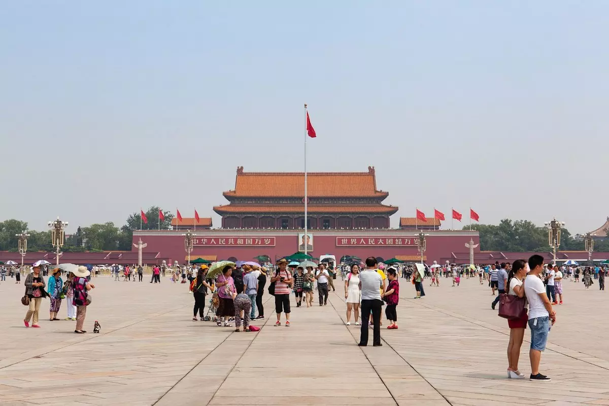 Du fortsætter til Den Himmelske Freds Plads, også kendt som Tiananmen Square. Under Ming- og Qing-dynastierne lå de kejserlige ministeriers kontorer her. Disse blev skadet under Bokseropstanden, og området blev ryddet, hvilket førte til opførelsen af Den Himmelske Freds Plads. I 1949 blev pladsen udvidet til dens nuværende størrelse (880 meter fra syd til nord og 500 meter fra øst til vest), som gør den til den største åbne plads i verden. Pladsen fik i tidernes morgen sit navn efter Den Himmelske Freds Port, der adskiller pladsen fra Den Forbudte By, der ligger mod nord.