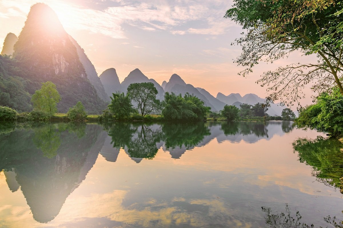 Yangshuo er omgivet af et nærmest poetisk landskab, der tager pusten fra enhver. Floden Li løber langs de høje kalkstensbjerge, der skyder op som prangende pukler i landskabet. Lidt uden for byen kan du opleve de flittige, lokale bønder, der plejer deres ris-, grøntsags- og blomstermarker.