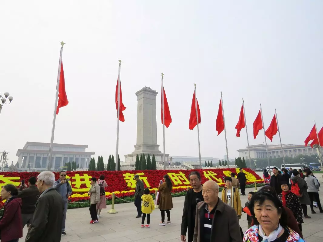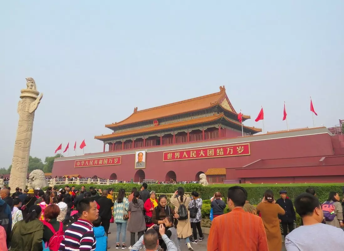 Fra pladsen går du til Den Forbudte By, der ligger bag Den Himmelske Freds Port, som er stedet, hvor Mao den 1. oktober 1949 udråbte Folkerepublikken Kina.