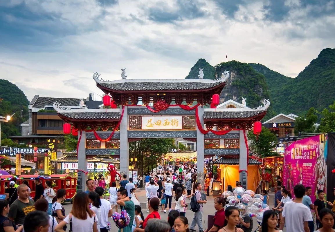 Inde i selve byen er der masser af leben. Her ligger restauranter og barer på stribe, og er du til shopping er West Street absolut et besøg værd. Gaden er den ældste gade i Yangshuo med en historie på mere end 1.400 år. Gaden er fyldt med restauranter, cafeer og butikker, hvor der kan købes smykker, tøj, sko, vifter, produkter lavet af bambus og bøffelhorn samt porcelæn og meget mere.