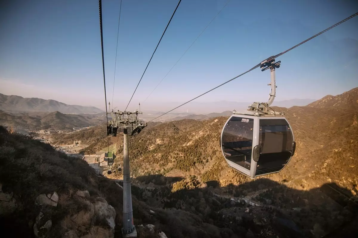 Muren er delt op i flere forskellige områder, og du besøger det mindre turistede område Mutianyu. Du og guiden bliver sat af på parkeringspladsen tæt ved Mutianyu, og herfra går du op ad en stejl vej til kabelbanen, der fører op til muren.