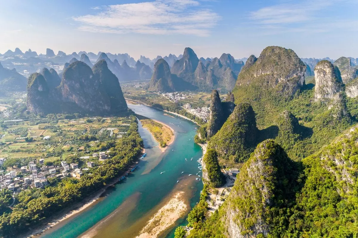 Efter morgenmaden bliver du hentet på hotellet og kørt til lufthavnen, hvorfra du flyver til Guilin. Uden for Guilin lufthavn venter en guide og chauffør med et skilt, hvorpå dit navn står. Sammen kører I til naturskønne Yangshuo, der ligger ca. halvanden times kørsel væk.