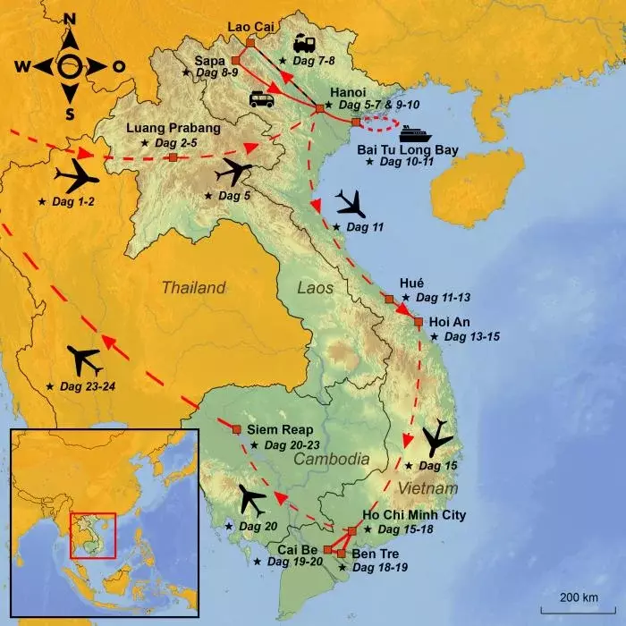 Rejsen starter i Laos i den tidligere kongeby Luang Prabang, som med sin afslappede atmosfære og velbevarede kolonistil er et højdepunkt i sig selv. Her kan du opleve munke i orange dragter indsamle almisse, nyde udsigten fra Phousi-bjerget, tage en dukkert ved det smukke Kuang Si-vandfald og gå på opdagelse blandt gadekøkkener og kunsthåndværk på byens natmarked.