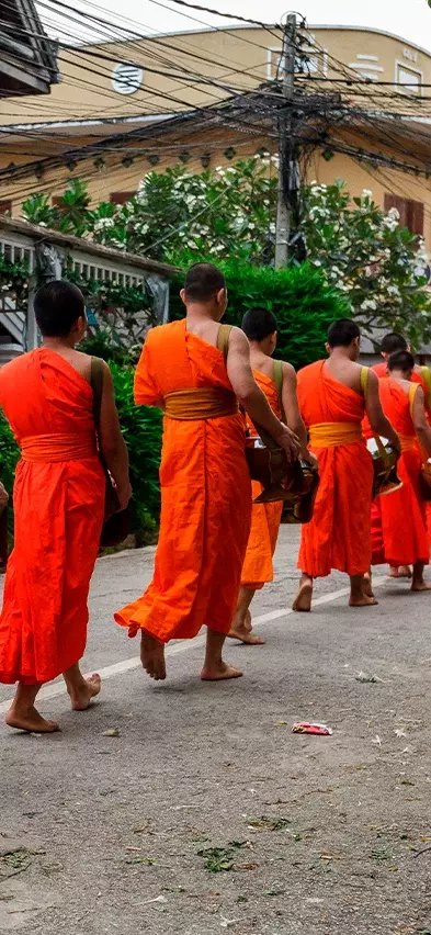 Hver morgen i de tidlige morgentimer udspiller der sig en helt særlig seance i Luang Prabang. Flere hundrede munke bevæger sig stille gennem gaderne for at samle almisser. Alle familier sender en repræsentant på gaden med mad eller drikkevarer, som bliver fordelt i munkenes skåle. Det er svært ikke at blive grebet af den respektfulde stilhed og store værdighed, som dette daglige ritual foregår med.