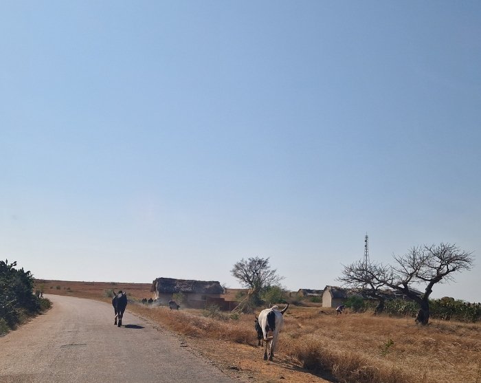 Fra Ihosy er der godt en times kørsel, inden du når til dagens slutmål, Ranohira. Ud over stepperne går det, og det er nemt at forstå, hvorfor Bara-folket driver deres kvæg her. Lange øde strækninger med knæhøjt græs, så langt øjet rækker – ja, det ligner næsten en østafrikansk savanne. Hist og her kommer en ung mand på cykel. Hvor han kommer fra, og hvor han dog er på vej hen her midt i ingenting, er ikke altid lige til at se.