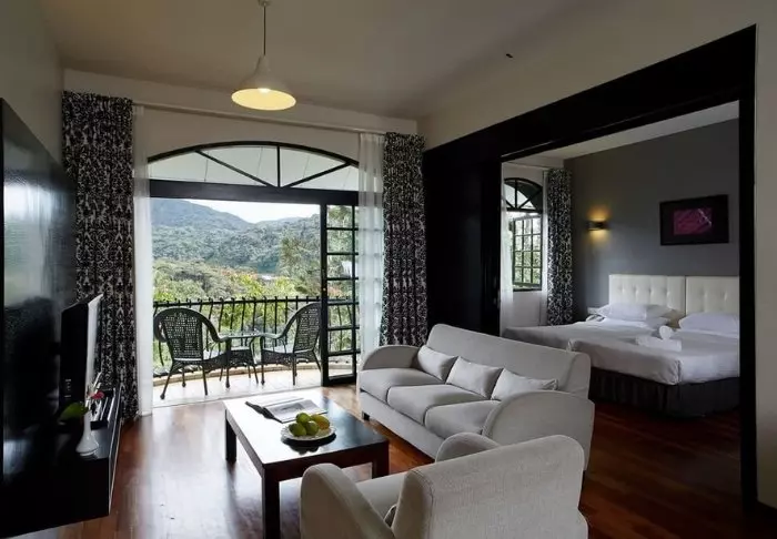 Værelserne er store (min. 44,6 m2) og indrettet med trægulve og mahognimøbler, som tilføjer en naturlig varme, mens friske orkideer giver lidt farve til de hvide, sorte og grå nuancer. Værelsernes store vinduer inviterer naturen indenfor og åbner op til en skøn udsigt over de grønne omgivelser. Indenfor finder du alt, hvad du behøver for at føle dig hjemme, fra bløde senge til et dejligt opholdsområde med sofa, bord og tv. Yderlige faciliteter inkluderer wi-fi, te- og kaffefaciliteter, gratis mineralvand på flaske og værdiboks, mens badeværelserne byder på bruser, hårtørrer og essentielle toiletartikler.