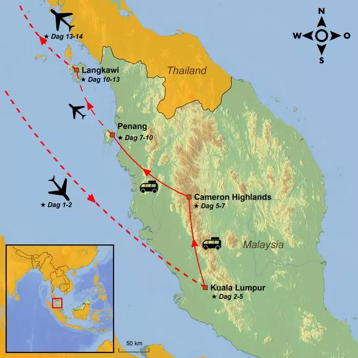 Rejsen viser dig Malaysias absolutte højdepunkter: fra Kuala Lumpurs høje puls og roen i Cameron Highlands til kulturen i George Town og Langkawis dejlige sandstrande.