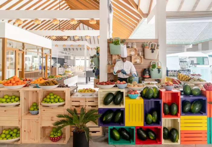På øen finder du tre spisesteder; Hovedrestauranten The Market som er lavet i stil med et udendørsmarked og som tilbyder et bredt udvalg af retter fra hele verden. Hver dag er der forskellige temaer, der vil forkæle dine smagsløg. Derudover findes det italienske pizzeria Il Basilico, som laver forskellige italienske retter og Chiringuito som både er en restaurant og bar, som bl.a. byder på grillmad.