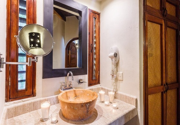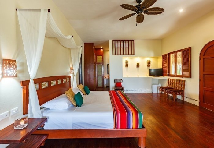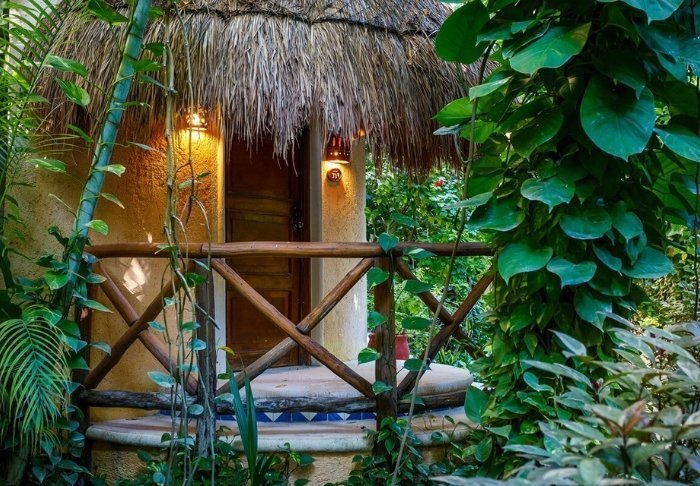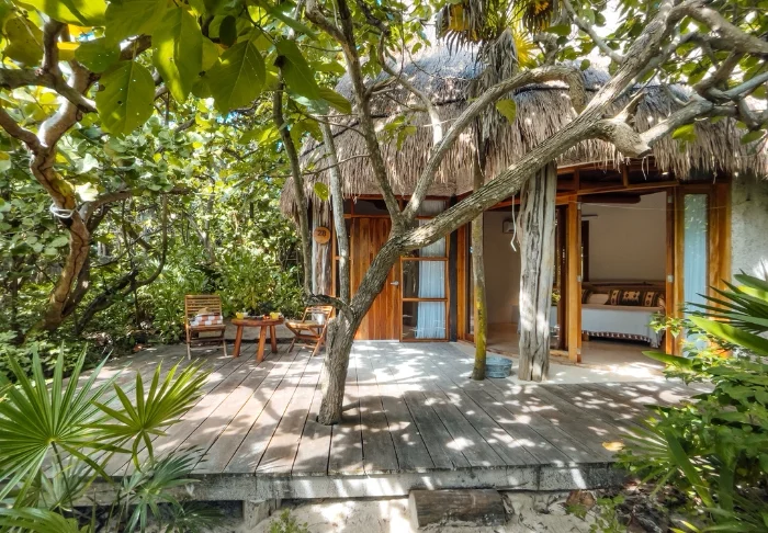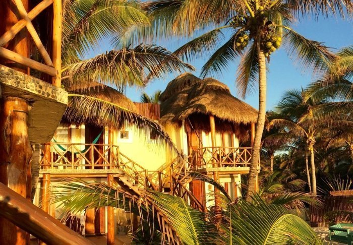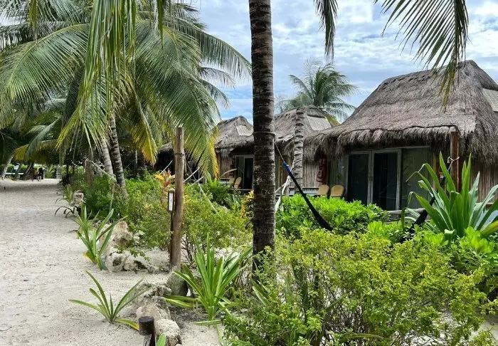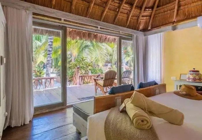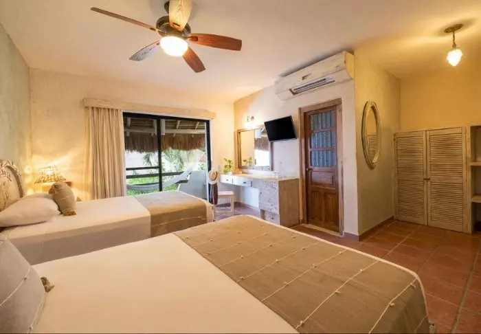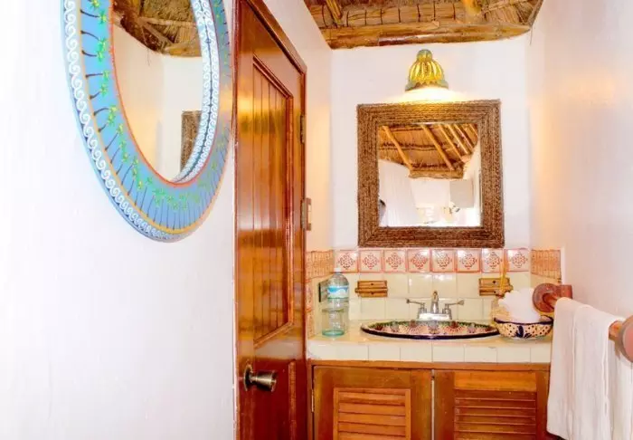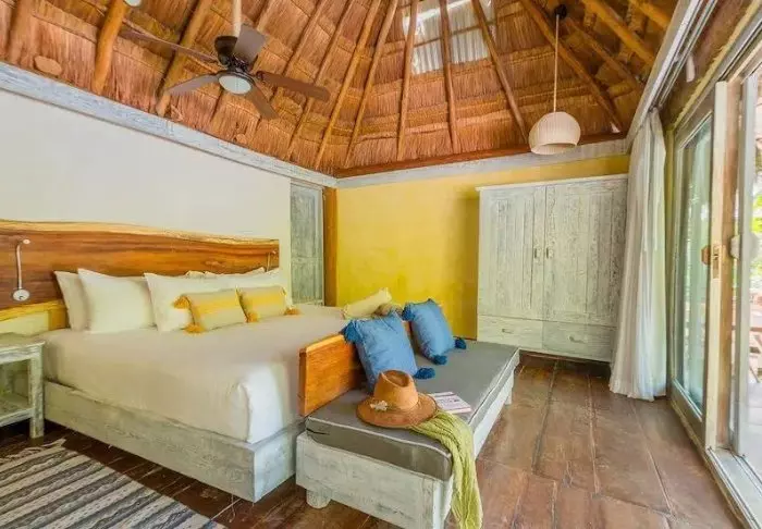 Du bor i charmerende hytter bygget i naturmaterialer bl.a. med tag lavet af tørrede palmeblade. Værelserne er rummelige og elegant indrettede med en harmonisk blanding af lyse farver, farverige mexicanske tæpper og puder samt smukke mørke trægulve og møbler.
