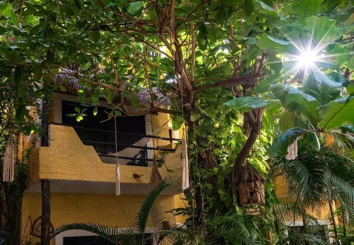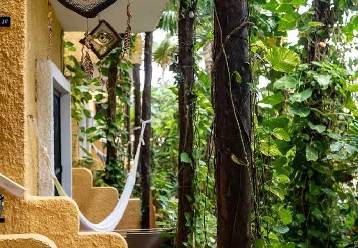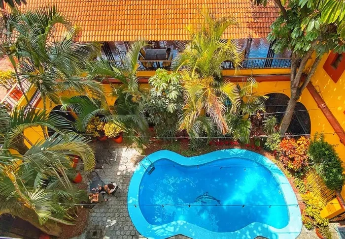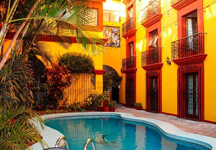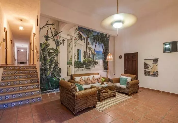 Du bliver budt velkommen til et farverigt hotel, der er malet i en palette af gule, røde og lilla farver, der giver stedet en hyggelig mexicansk stemning.
