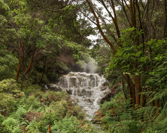 Du passerer steder med navne som “Inferno Pools”, “Sulphur Crystal Valley” og “Cooking Pool”, hvor temperaturen når op mod 100 grader. Et af højdepunkterne er Kakahi Falls – New Zealands største varme vandfald, som traditionelt blev brugt af maorikrigere til heling efter kamp.