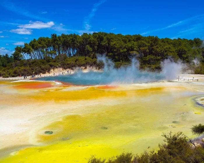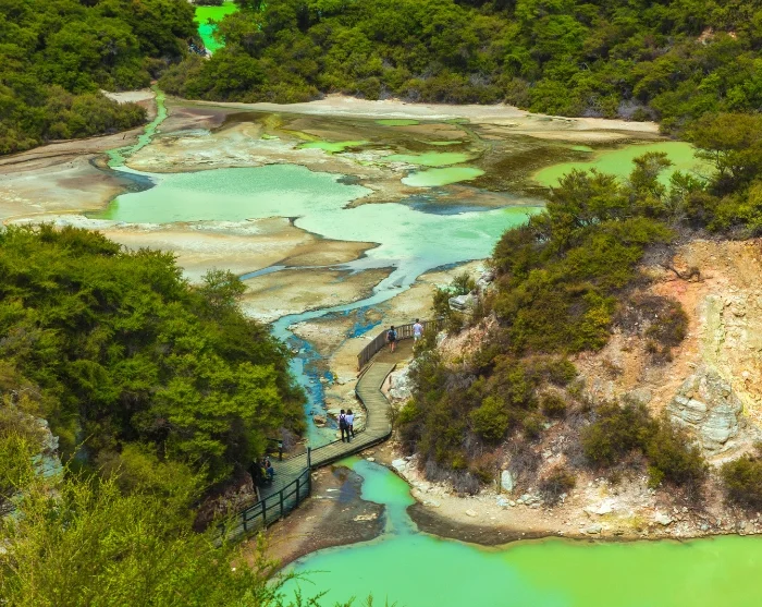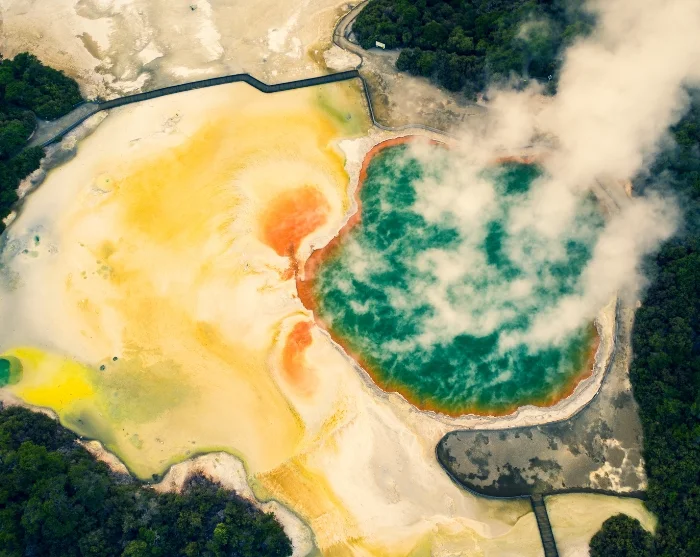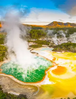 Byen er bygget oven på en aktiv vulkansk zone, og hvis du drømmer om at mærke naturens kræfter, så er du kommet til det rigtige sted. Overalt i området sprutter gejsere, mudderpøle bobler, og varme kilder damper. Og denne geotermiske aktivitet, som byen er så kendt for, har gjort Rotorua til et wellness-hotspot i New Zealand.