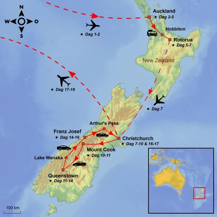 Rejsen begynder i Auckland på Nordøen, landets livlige metropol, omgivet af vand og vulkaner. Herfra bevæger du dig ind i landet til det fortryllende Hobbiton, hvor kulisserne fra Ringenes Herre venter som en eventyrlig tidslomme. I Rotorua oplever du stor geotermisk aktivitet med boblende mudderpøle, varme kilder og autentisk maorikultur.
