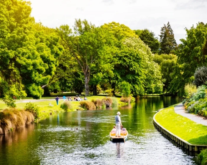 Start eventuelt med en gåtur i det centrale Christchurch, hvor historisk charme møder moderne arkitektur. Tag med den klassiske, historiske sporvogn, der kører i ring gennem byens centrum og stopper ved flere af de største seværdigheder. Du kan også opleve byen fra vandsiden på en romantisk sejltur i en gondolinspireret båd, der stages stille frem på Avon-floden.