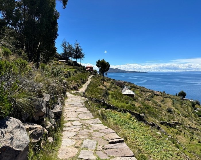 Du nyder en frokost på den smukke kuperede ø, og bagefter tager din guide dig med på en gåtur op til øens højeste punkt, hvorfra der er en betagende udsigt over Titicaca-søen, med høje bjerge i baggrunden.