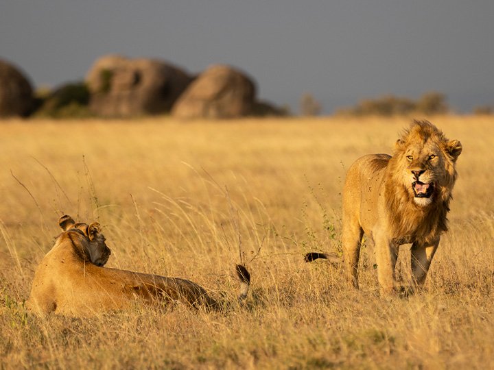 Så mens du er på udkig efter de mageløse dyr, kan du nyde den omkringliggende natur, hvor de åbne græssletter prydes af spredte akacietræer, bakker er dækket af tæt bevoksning, vandhuller tiltrækker parkens dyr og kopjerne, de karakteristiske stenformationer, rejser sig op af savannen og henleder vores tanker til ”Løvernes Konge”, så vi næsten forventer Rafiki dukke op og vise baby Simba frem med fremstrakte arme.