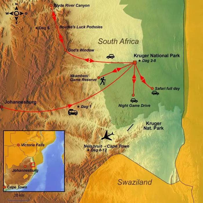 I dag skal du på en meget scenisk heldagstur langs Panoramaruten i de dramatiske Drakensbjerge. Drakensbjergene er røde og danner en fantastisk kontrast til de grønne træer og planter. Du oplever Blyde River Canyon, der er op mod 700 m dyb og 60 km lang og dermed er verdens tredje største canyon. Du gør stop ved de tre vigtigste udsigtspunkter langs kløften; God’s Window, Bourke’s Luck Potholes og De Tre Rondaveller. De Tre Rondaveller er 3 meget smukke og markante klippeformationer, der i udseende minder om de runde hytter, som tidligere fandt i lokale landsbyer mange steder i det sydlige Afrika. Der er også mange vandfald på Panomararuten, og du gør gør stop ved et af dem. Det kan være Berlin Falls, hvor vandet falder 150 meter ned i en sø. Eller måske er stoppet ved Lisbon Falls, der ligger hvor Blyde River deler sig i to og derefter falder 92 m ned over en næsten lodret klippe og igen samles til et løb. Der er mange andre vandfald, og guiden afgør hvor stoppet bliver. Et af dagens mest spektakulære besøg vil klart være Bourke’s Luck Potholes, der er cylindriske huller slidt ned i klipperne af vand og sand gennem tusindvis af år. Du kan komme helt tæt på dette naturfænomen langs nogle broer, der er bygget hen over de særegne huller.