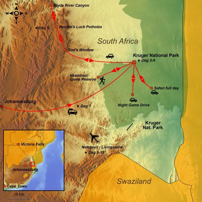 Først oplever du Sydafrikas smukke natur og dyreliv på Kruger-safari fra din lodge, som ligger et stenkast fra Kruger Nationalpark. Du slutter rejsen ved et af verdens mest spektakulære vandfald.