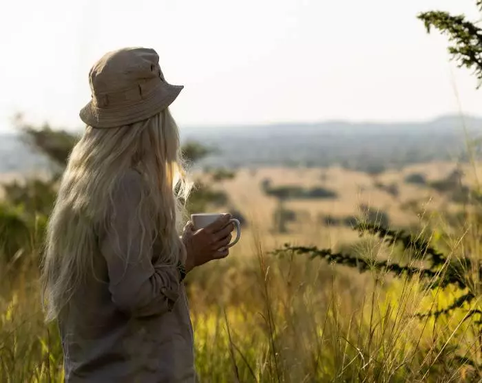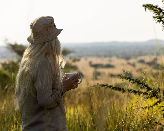 I Serengeti står man op sammen med solen, og det er altid spændende at høre, om lejren mon har haft besøg i løbet af natten.