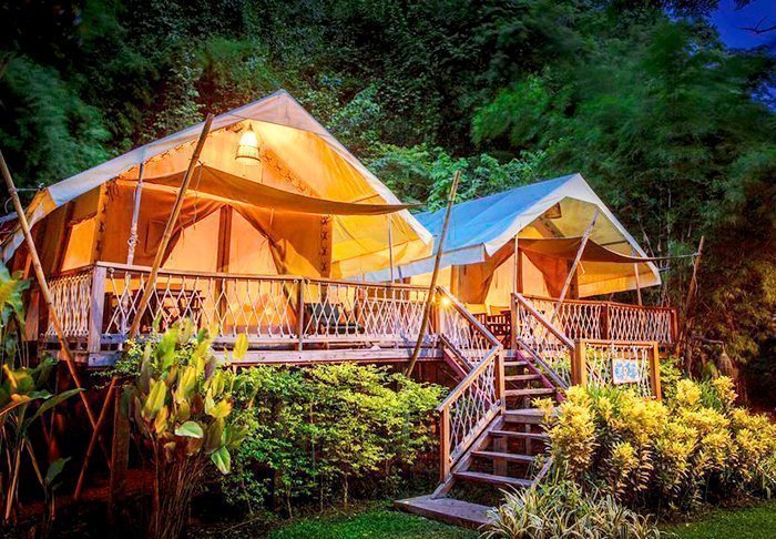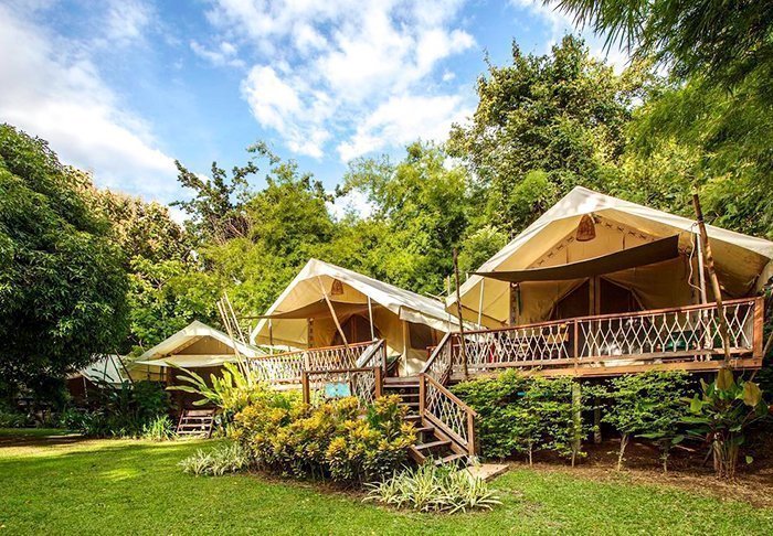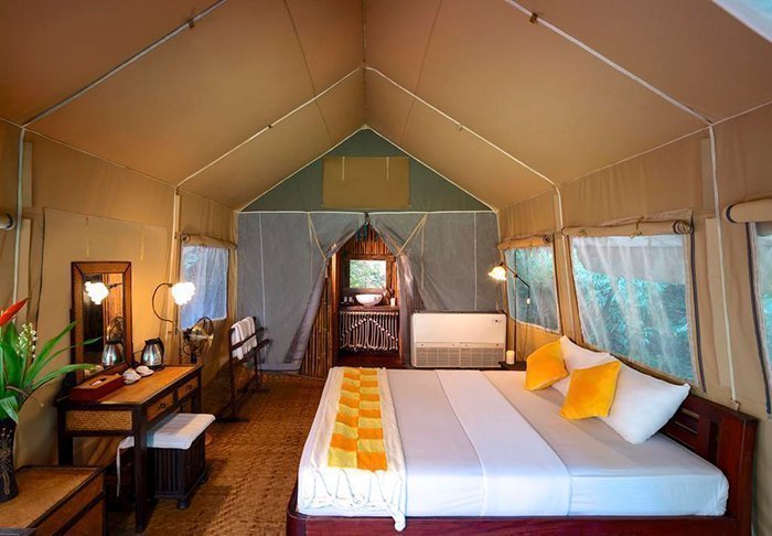 Campen består af 38 luksuriøse lærredstelte på mellem 26 og 32 m², der er hævet en halv meter over jorden. De har alle rigtige senge, eget badeværelse med varmt vand, hårtørrer og toiletartikler samt egen veranda, hvorfra du kan nyde stilheden og de frodige omgivelser. Samtlige telte har desuden både wi-fi, aircondition, make-up bord/skrivebord, gratis mineralvand på flaske, køleskab og elkedel til te og kaffe. Efter kl. 22 skal der være stille i campen – altså ingen høj musik, kun junglens lyde.