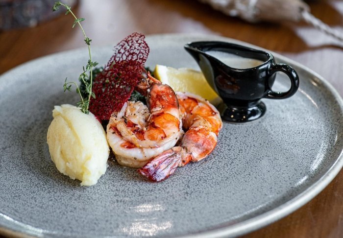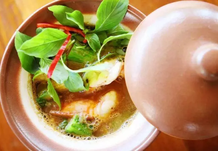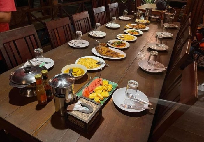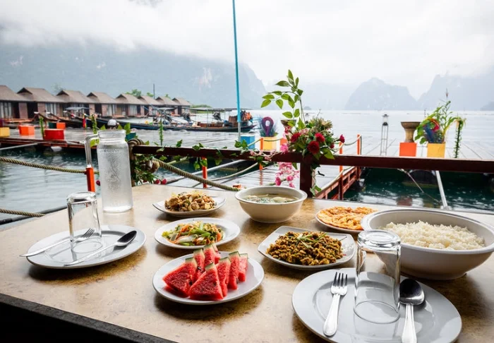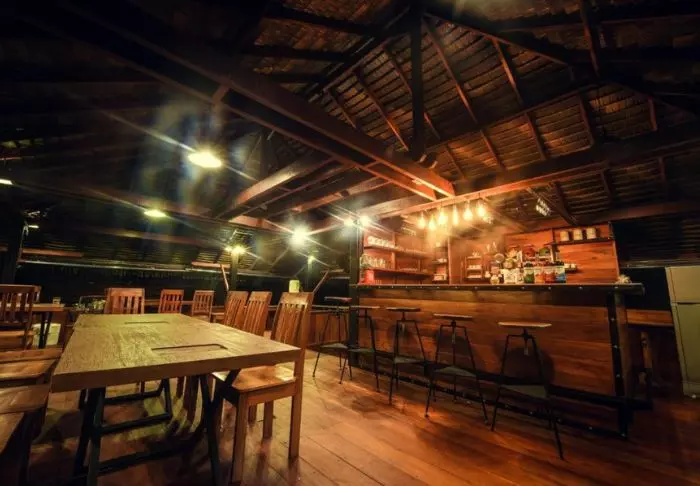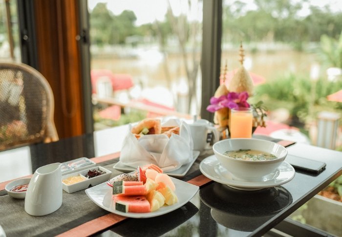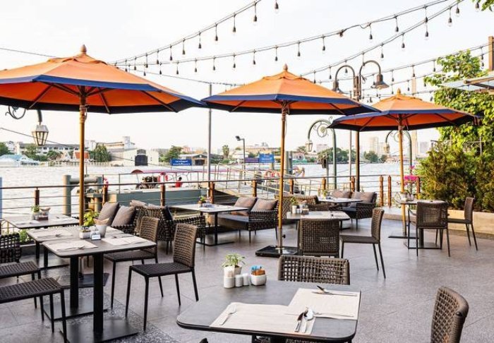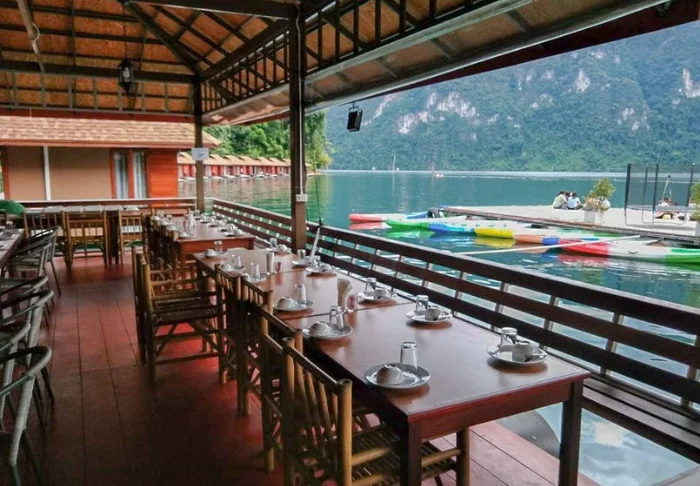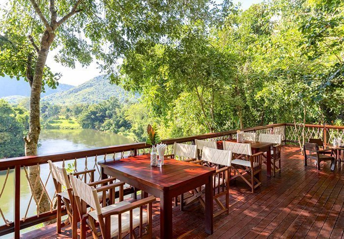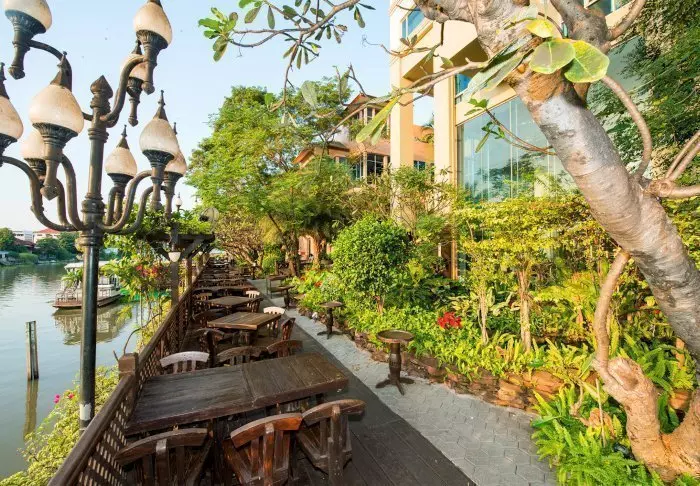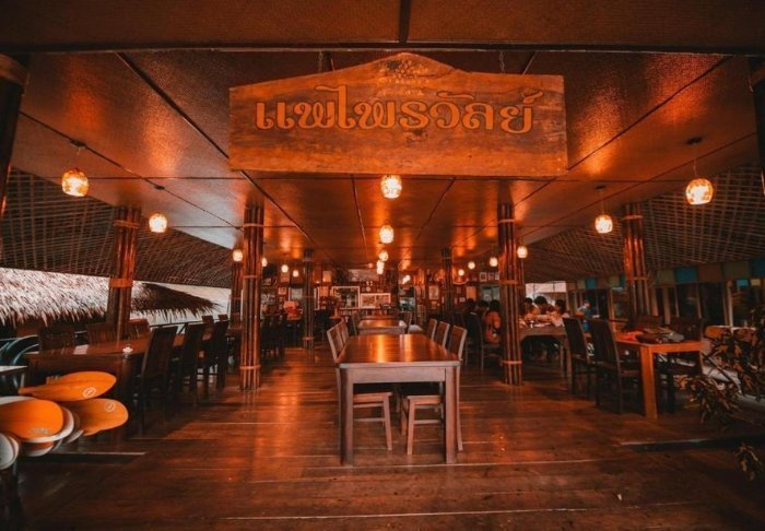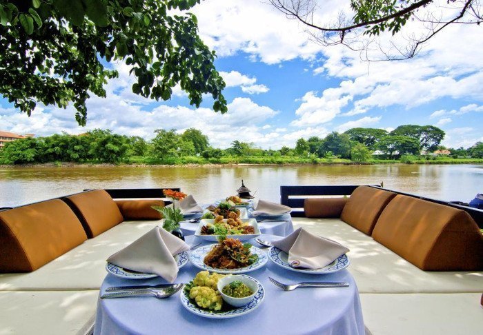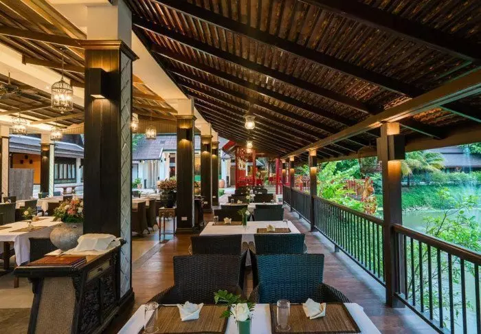 Maden serveres som lækre thailandske retter i en hyggelig, åben restaurant med udsigt over floden. Når mørket falder på, bliver stedet oplyst af lanterner, hvilket giver en magisk stemning.