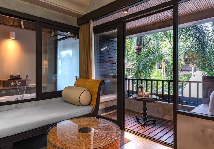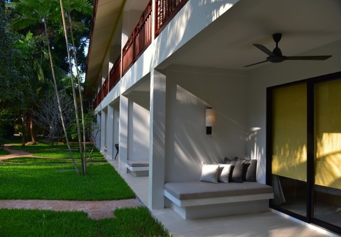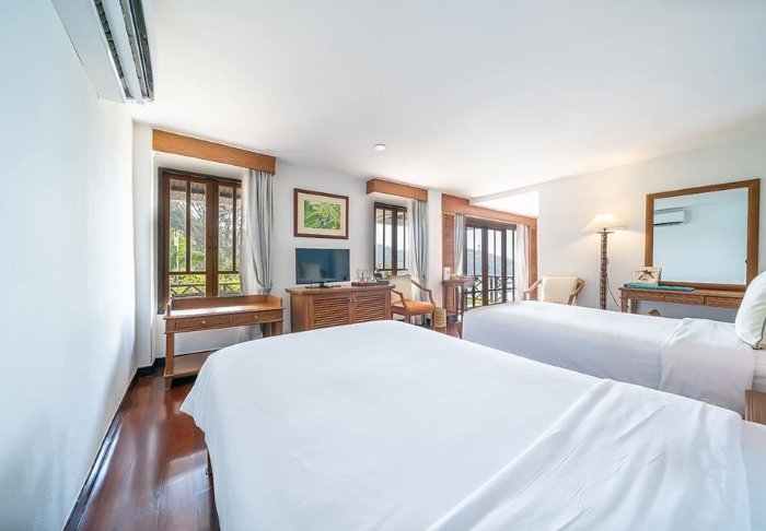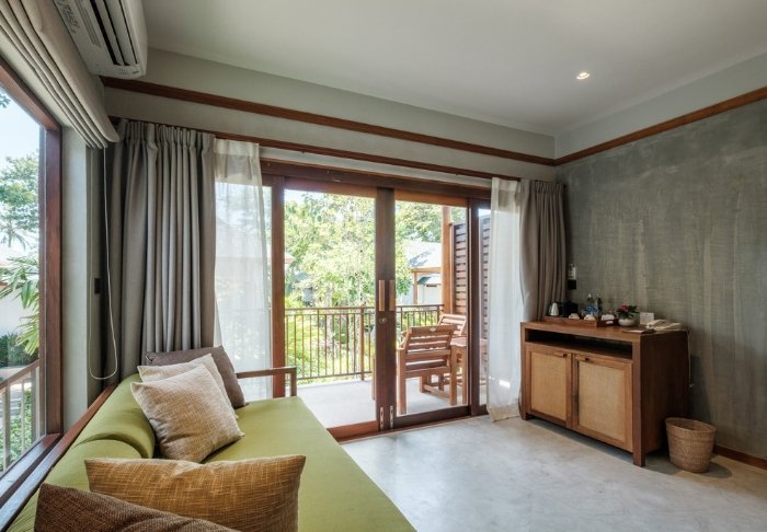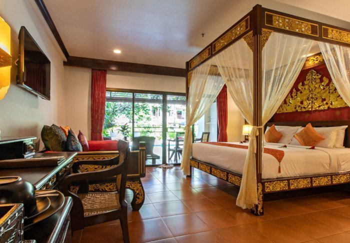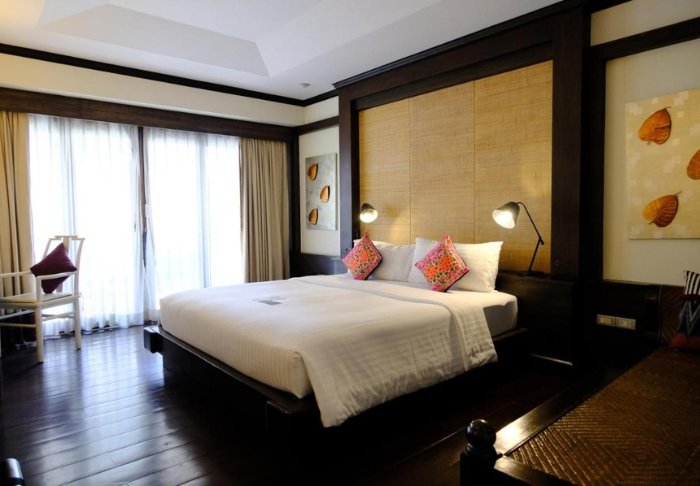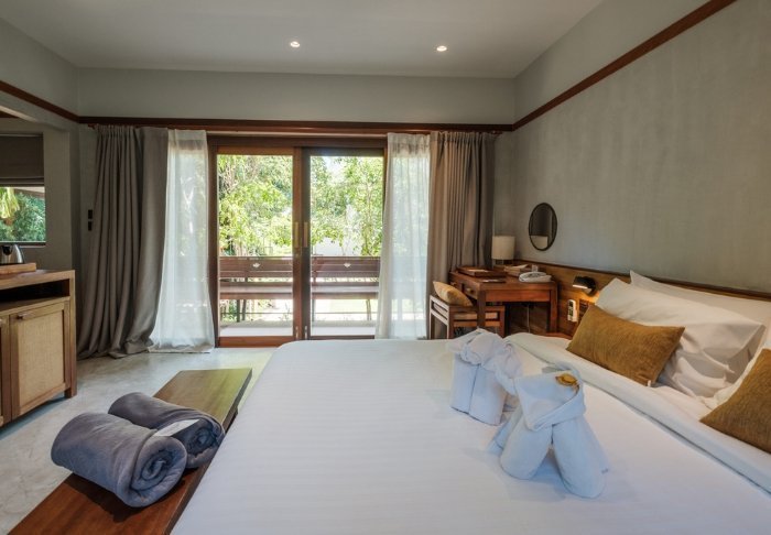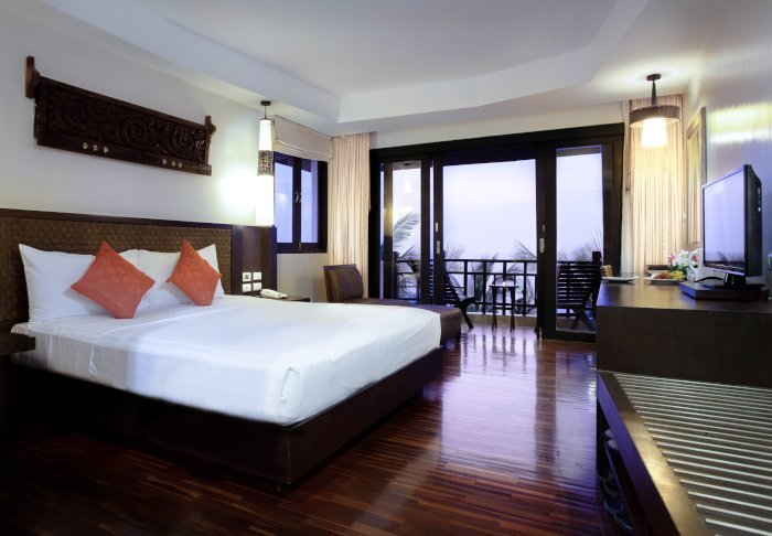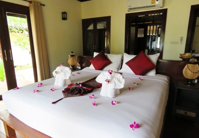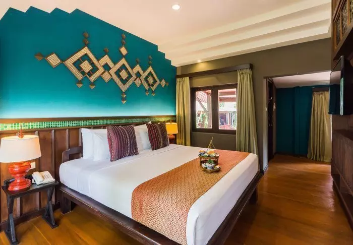 Værelserne er ligeledes indrettet i thai-stil med smukke træudskæringer og flotte mønstrer på puder og tæpper. Her er TV, kaffe- og tefaciliteter, aircondition, sikkerhedsboks, minibar, hårtørrer – og en paraply, hvis der skulle komme et tropisk regnskyl. Alle værelser har egen balkon.