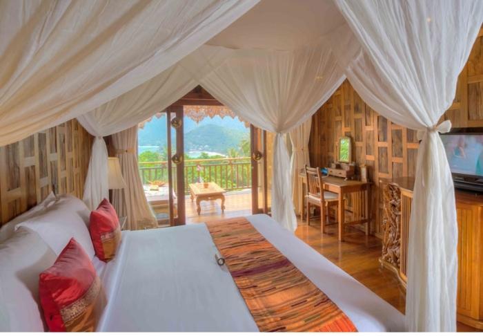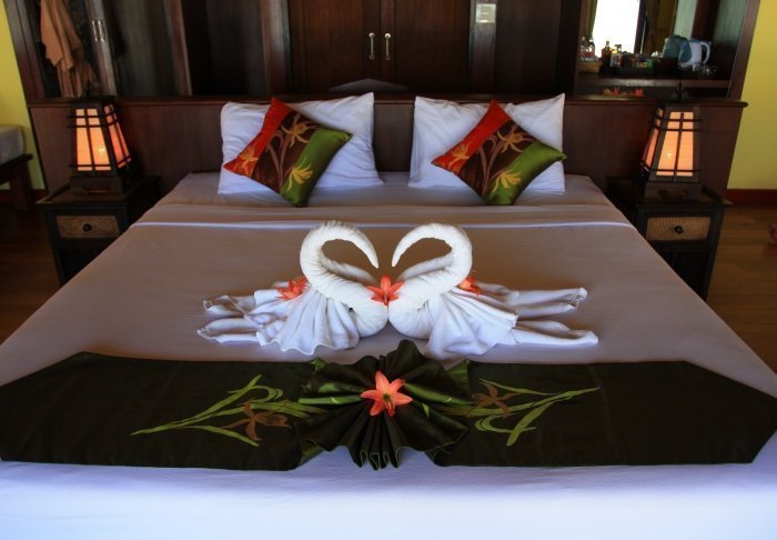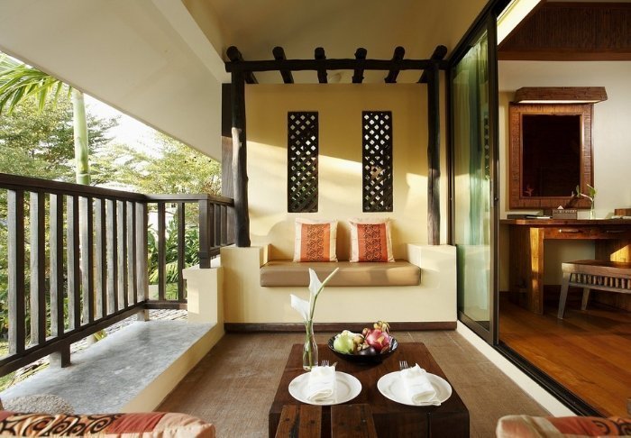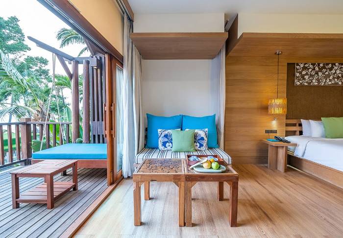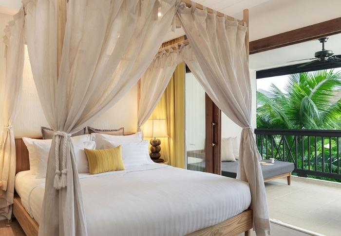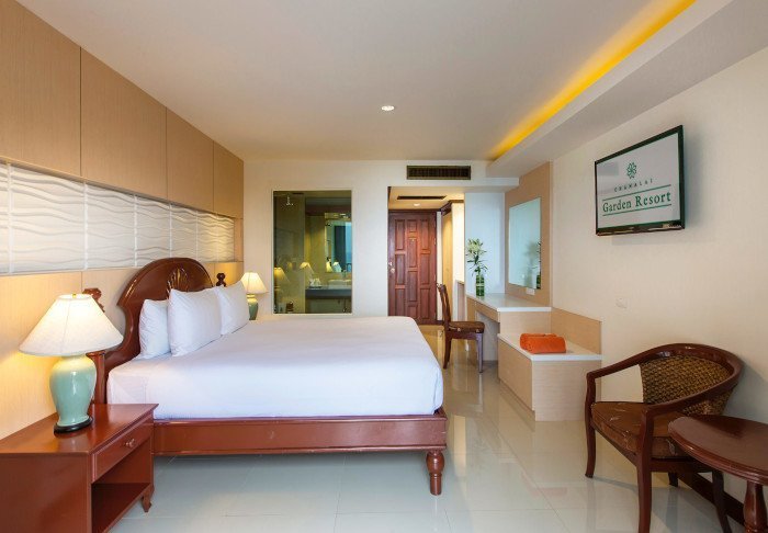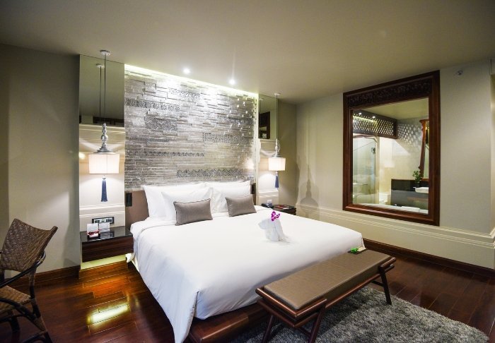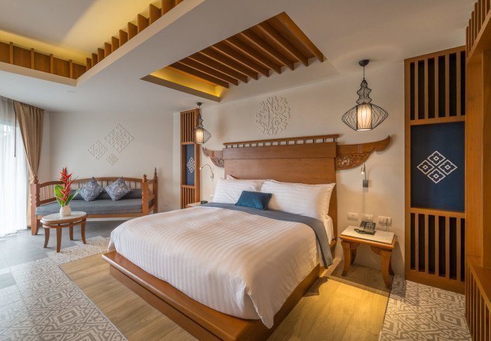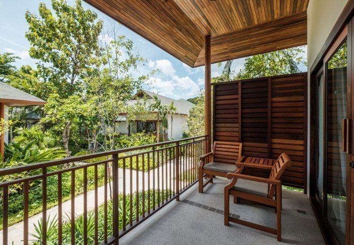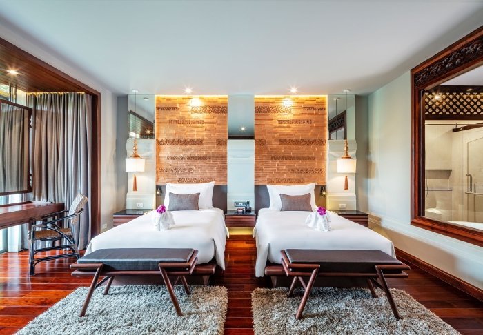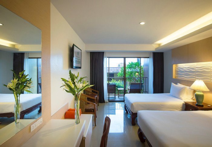 Værelserne er ligeledes indrettet i thai-stil med smukke træudskæringer og flotte mønstrer på puder og tæpper. Her er TV, kaffe- og tefaciliteter, aircondition, sikkerhedsboks, minibar, hårtørrer – og en paraply, hvis der skulle komme et tropisk regnskyl. Alle værelser har egen balkon.