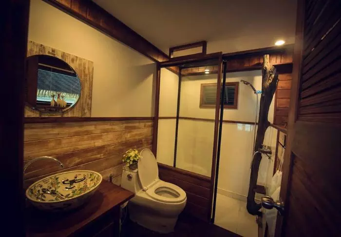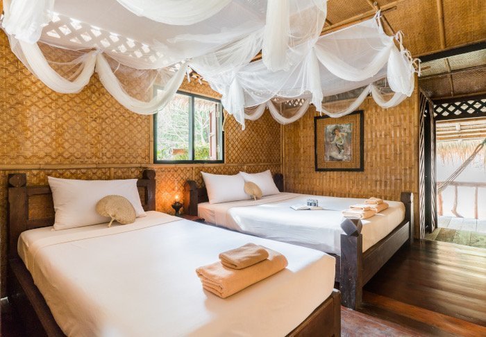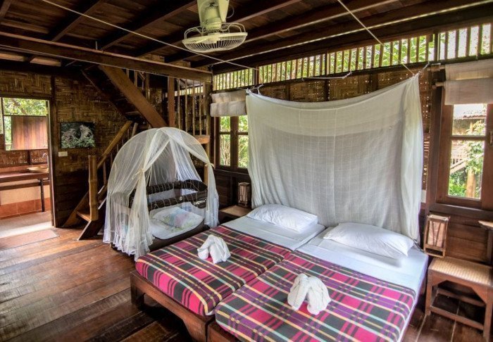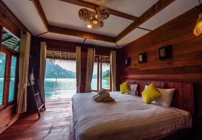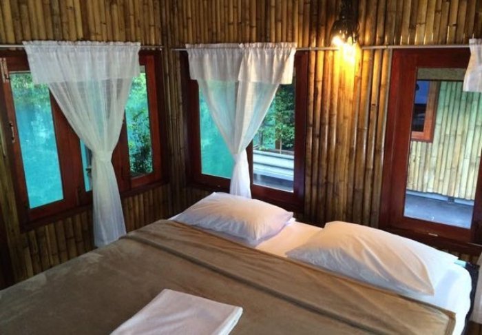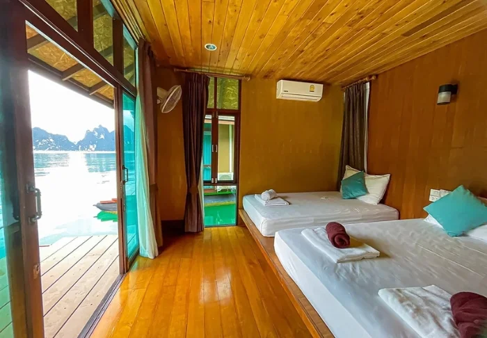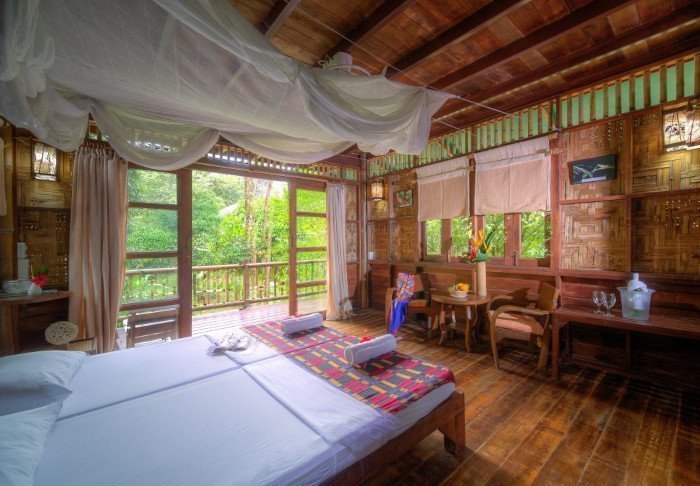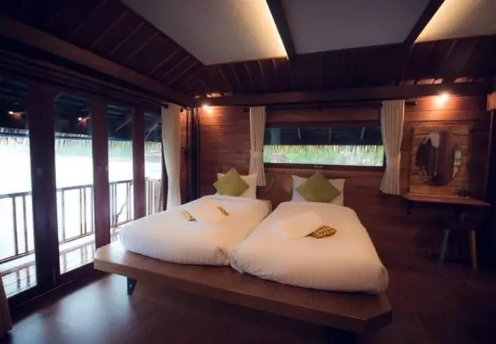 Flotellet har to sektioner med i alt 100 bambushytter. Værelserne er enkelt indrettet med komfortable senge og myggenet, håndholdt vifte, lommelygte, make- up bord, mineralvand på flaske samt redningsvest. Værelserne har ingen elektricitet og derfor heller ingen minibar eller wi-fi. På din private veranda kan du slappe af i en hængekøje, mens du nyder udsigten over den stille flod med kæmpestore bambus på bredden og vilde orkidéer i træernes grene. Du kan også tage en forfriskende dukkert direkte fra verandaen eller sejle i kano. Hvert værelse har desuden eget badeværelse med toilet, toiletartikler og koldt vand i bruseren.