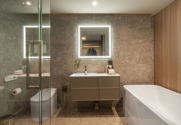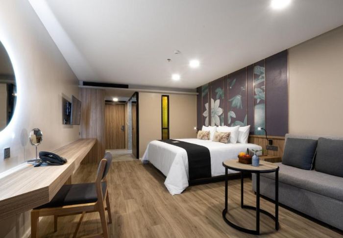 Værelserne er moderne indrettet i lyse farver og med møbler i træ. Her findes både skrivebord og et lille siddeområde med sofa og sofabord. Alle værelser er udstyret med aircondition, værdiboks, tv, minibar og et lille køleskab. På badeværelset findes hårtørrer, toiletartikler, morgenkåbe samt slippers.