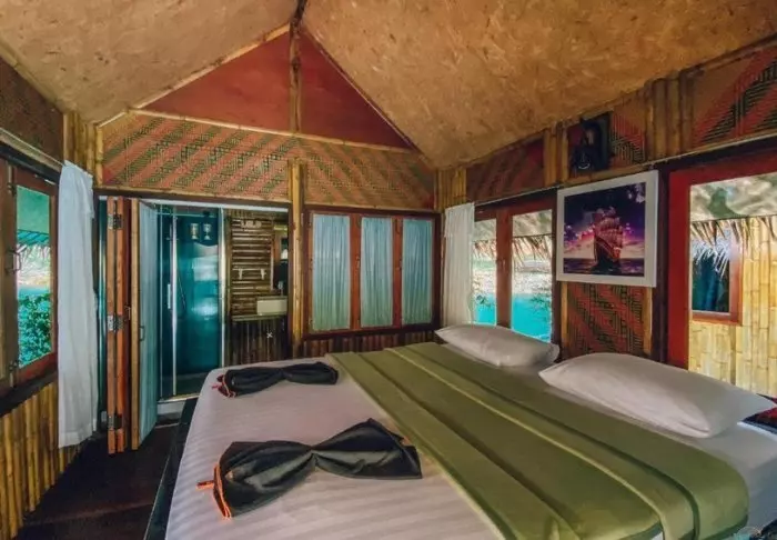 Der er i alt 30 bungalower, og vi benytter som udgangspunkt deluxe-værelserne med plads til to personer. De er bygget i traditionel stil med vægge af vævet bambus, møbler i massivt træ og bløde, hvide gardiner, som sammen skaber en enkel og harmonisk stemning. Værelserne har privat badeværelse med koldt vand i bruseren. Alle bungalower har myggenet, loftsventilator og egen veranda med udsigt til søen. Der medfølger desuden kajak og to redningsveste.