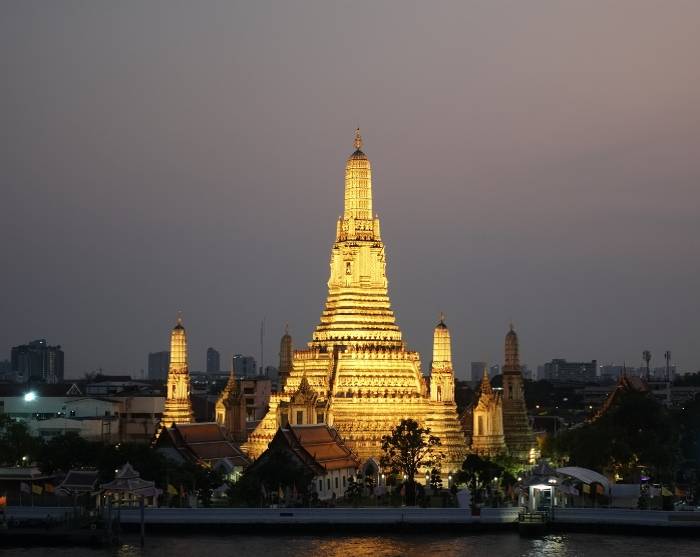 Aftenen slutter på en afslappet rooftop-bar ved Chao Phraya-floden med udsigt til det oplyste tempel Wat Arun. Udsigten bliver ikke meget bedre!