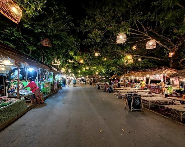 Næste stop er et lokalt natmarked, hvor du får tid til at gå rundt mellem de mange boder. Her bliver du klogere på lokale delikatesser, f.eks. braiseret svineben (khao kha mu), kokosbudding og sticky rice med æg (bua loi khai waan).