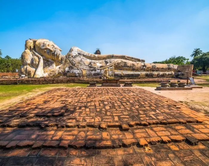 Sidste besøg er det gamle kloster Wat Lokaya Sutha. Her står ikke meget tilbage udover resterne af de gamle gulve, vægge og søjler. Stedets store attraktion er den 37 meter lange liggende Buddha med det fredelige smil.
