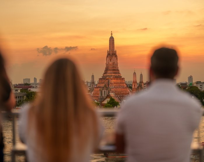 Aftenen slutter på en afslappet rooftop-bar beliggende ved Chao Phraya-floden med udsigt til det oplyste tempel Wat Arun. Udsigten bliver ikke meget bedre!