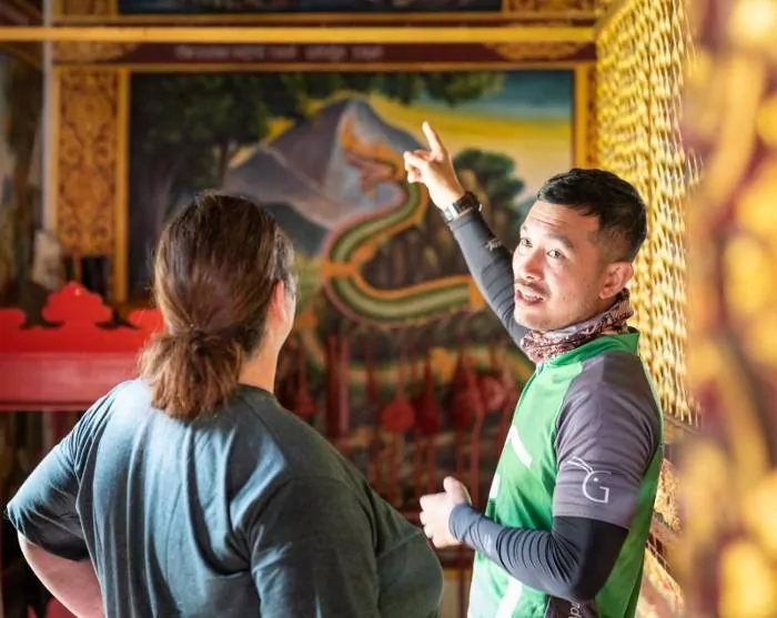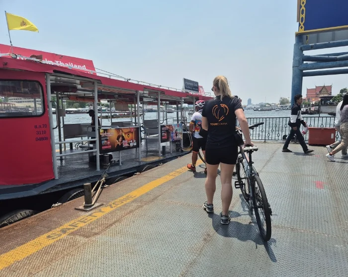 Efter en kort briefing og tilpasning af cyklen begiver du dig afsted sammen med en dygtig og erfaren cykelguide. Ruten er nem og flad, så de fleste kan være med. Du cykler gennem det populære backpacker-område, Khaosan Road, og videre gennem små gyder og forbi små kanaler. Du fortsætter langs Chao Phraya-floden til Rama VIII-broen, hvor du krydser floden til det vestlige og autentiske Bangkok. Her besøger du gamle templer og oplever lokallivet tæt på. Turen fortsætter langs den store kanal, Bangkok Noi, gennem små, stille gader og forbi en lokal landsby, hvor de lokale gladeligt sender smil og vink din vej. Du krydser en lille bro og cykler over på den anden side af kanalen, hvor du kommer forbi buddhistiske templer og Thonburis togdepot. Herefter tager du færgen tilbage til det østlige og livlige Bangkok, hvor du cykler forbi kongepaladset Grand Palace. Du stiller cyklen og går en tur i den fine, nærtliggende park, Saranrom, som engang kun blev brugt af den kongelige familie. Du sætter dig igen i sadlen og cykler forbi et duftende madmarked. Du ankommer til Giant Swing, som er turens sidste stop og et af Bangkoks populære vartegn.