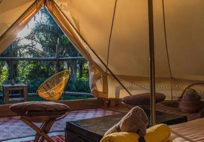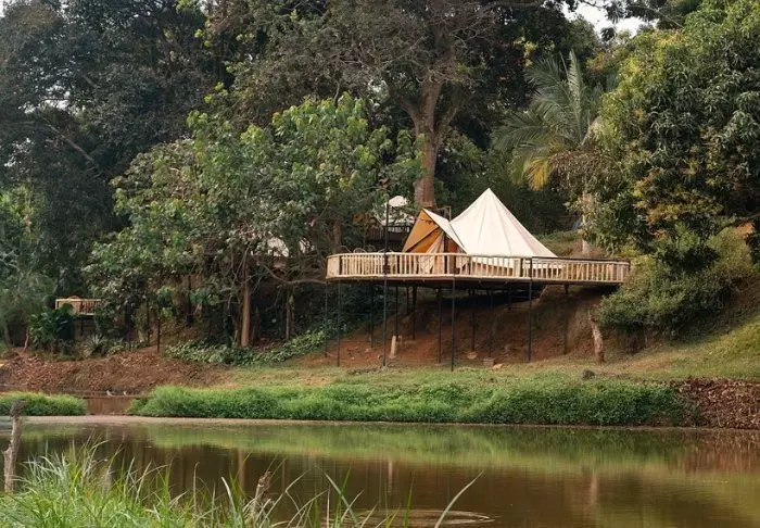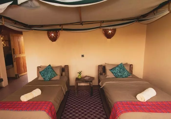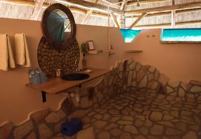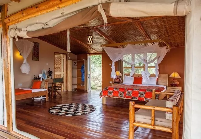 Lodgen består både hytter og telte, som alle er charmerende indrettet og har eget bad/toilet og egen veranda. Der er udelukkende brugt lokale materialer til lodgen og alt er bygget af lokale håndværkere, så indtægterne er kommet de lokale samfund i området til gode.