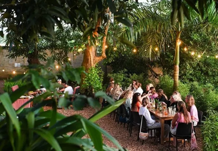 Fra den stråtækte restaurant og bar kan du nyde den smagfulde hjemmelavede mad eller en dejlig drink, mens du beundrer den maleriske natur og den skønne lille naturlige sø.