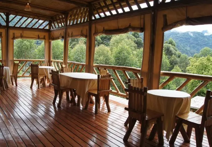 Til hovedbygningen hører en stor panoramaterrasse, der strækker sig hele vejen langs bygningens forside, hvorfra du kan nyde udsigten over skoven, mens du lytter til skovens fugle og den rislende flod. Herude blandt naturens afslappende lyde kan du også spise din morgenmad og aftensmad eller drikke din eftermiddagste, eller du kan vælge at spise indenfor i varmen fra pejsens glødende ild. Morgenmad, frokost, eftermiddagste og aftensmad er inkluderet.