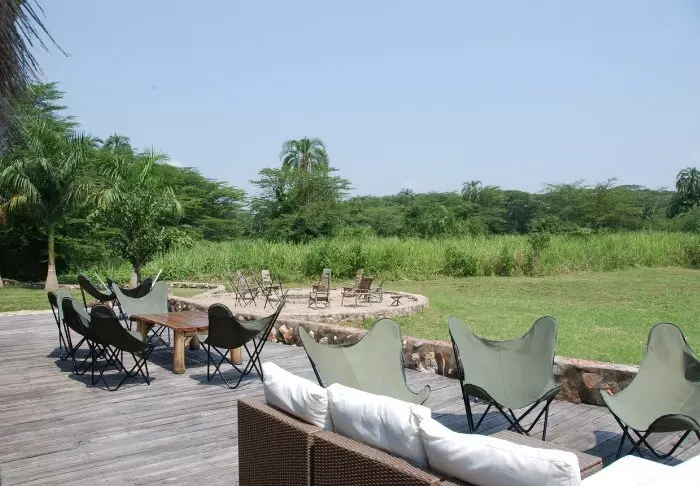 Poolen er bygget på et trædæk i forlængelse af græsplænen og byder på både solsenge og udsigt. Om aftenen tændes der op i bålet, og med en lokal øl i hånden kan der udveksles historier fra dagens safari.