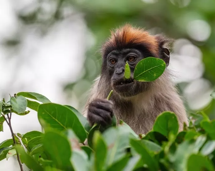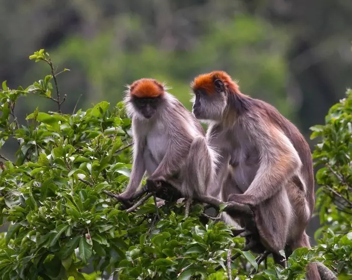 Hvor du i Murchison Falls kan opleve store variationer i landskabet med både flod, savanne, sump og skov, er Kibale kendetegnet ved primært at bestå af tæt, fugtig regnskov. Det er et af de bedste steder i Afrika at se primater i det fri. Chimpansen er nok den mest kendte af dem alle, men her i skovene findes også både den røde colobusabe og den sort-hvide colobusabe, den flotte L’Hoest’s abe samt flere andre arter.